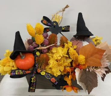 冬あじさい、われもこう、ガーベラ、ブルーベリー、モロッコインゲン、紅葉した葉っぱたちと魔女に扮したかぼちゃやお化けがハロウィンを楽しもうとにぎやかに集まってきました。そして全体を〈秋〉のイメージにしよう!と色合いを合わせる一方で、それぞれの発想で〈個〉も演出したいと工夫をこらしました。そうして出来上がった作品は、穏やかさの中に個々が自由に輝き、全体としても和やかで情緒豊かな一品となりました。