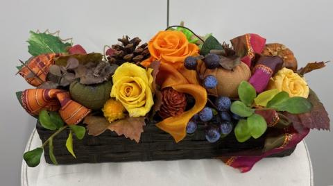 紅葉した葉の色を思わせるオレンジや黄色のバラ、そしてかぼちゃ、柿、ブルーベリー、松ぼっくりやどんぐり達がひとつのかごに飾られています。そしてそこに素敵なリボンが添えられ秋の収穫をお祝いするかのようにいろどり豊かで華やかな一品となっています。